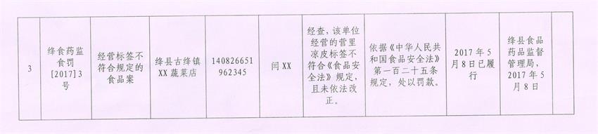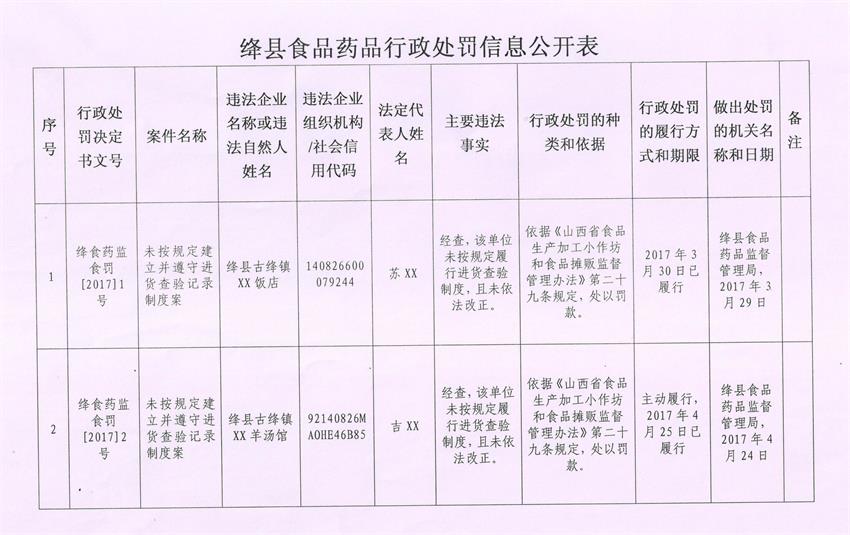 绛县食品药品监督管理局行政处罚信息公示