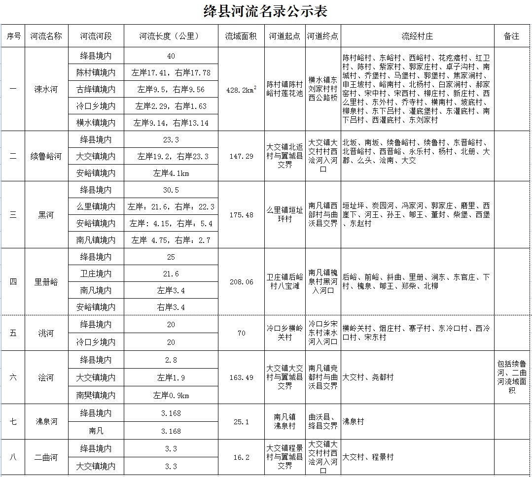 根据县委、县政府“关于印发《绛县全面推进河长制实施方案》的通知”安排部署,现将我县涑水河、黑河、续鲁峪河、里册峪河、洮河、浍河、沸泉河、二曲河的流域面积、河道长度、各乡镇河段长度以及流经的村庄予以公示(具体见附表绛县河流名录公示表)。