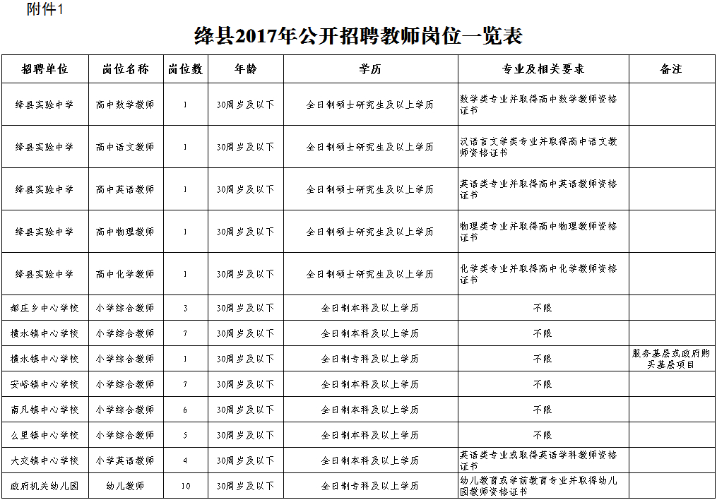 附:《绛县2017年公开招聘教师岗位一览表》