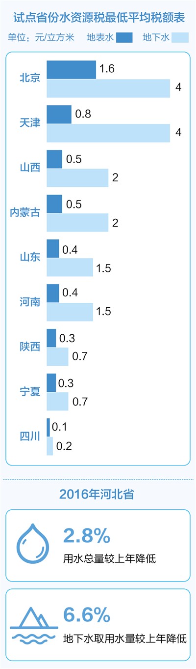 “北京、天津、山西、内蒙古等4个省份位于华北地区,其他5个省份分布在东、中、西部,其水资源丰枯程度不一、取用水类型多样,具有一定代表性。”王建凡表示,通过扩大试点,有利于进一步发挥税收杠杆调节作用,有效抑制不合理用水需求,促进水资源节约保护;同时为全面推开水资源税制度积累经验、创造条件。