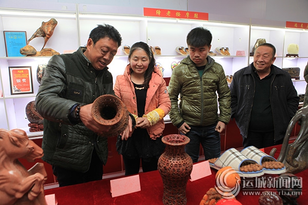 12月23日,绛县非遗传统技艺展馆工作人员(左一)在向市民介绍该县的非遗产品。 记者 黄文鹏 摄